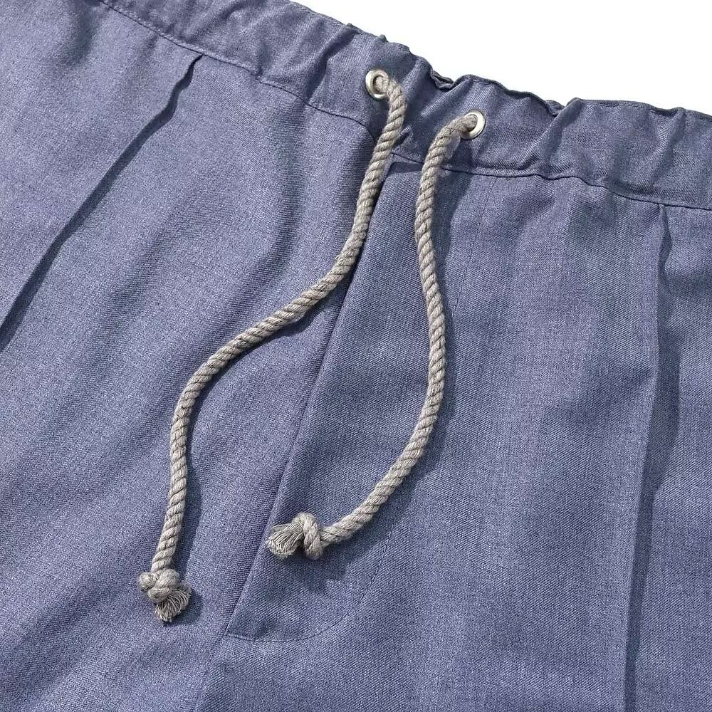 ウエスト内部にはゴムベルトを取り付け、サイズ調整紐には風合いのあるメランジュツイストコードを採用。